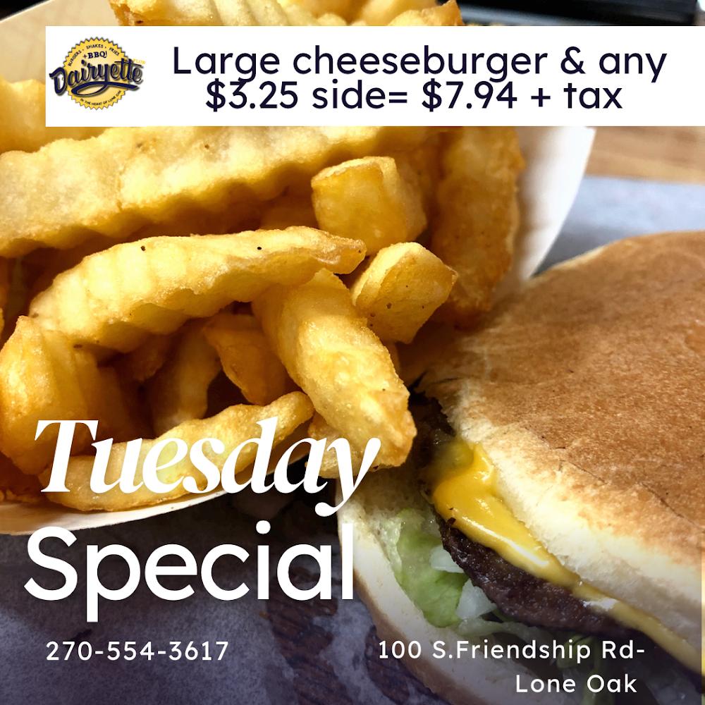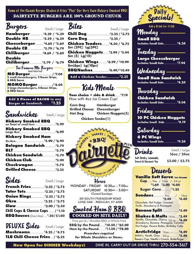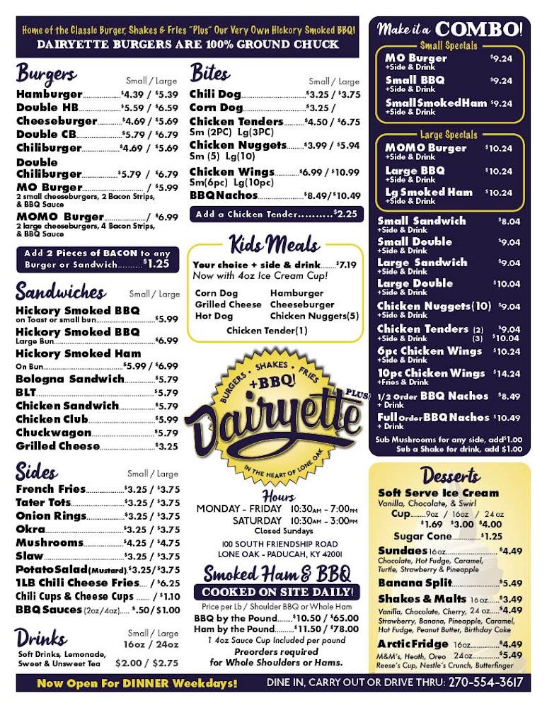 Welcome to Dairyette "Plus," your go-to destination for old-fashioned burgers, creamy shakes, and crispy fries, all enhanced by our unique smoked BBQ. Located at 100 S Friendship Rd, Paducah, KY, we pride ourselves on serving delicious, simple cuisine in a relaxed and charming atmosphere. Enjoy our outdoor terrace, convenient drive-thru, and takeout options, perfect for families, students, and tourists alike. Whether you're here for lunch, dinner, or to indulge in our excellent desserts, we’ve got something for everyone. With wheelchair-accessible facilities and a commitment to quality, Dairyette "Plus" is the place to savor local specialties and create lasting memories.